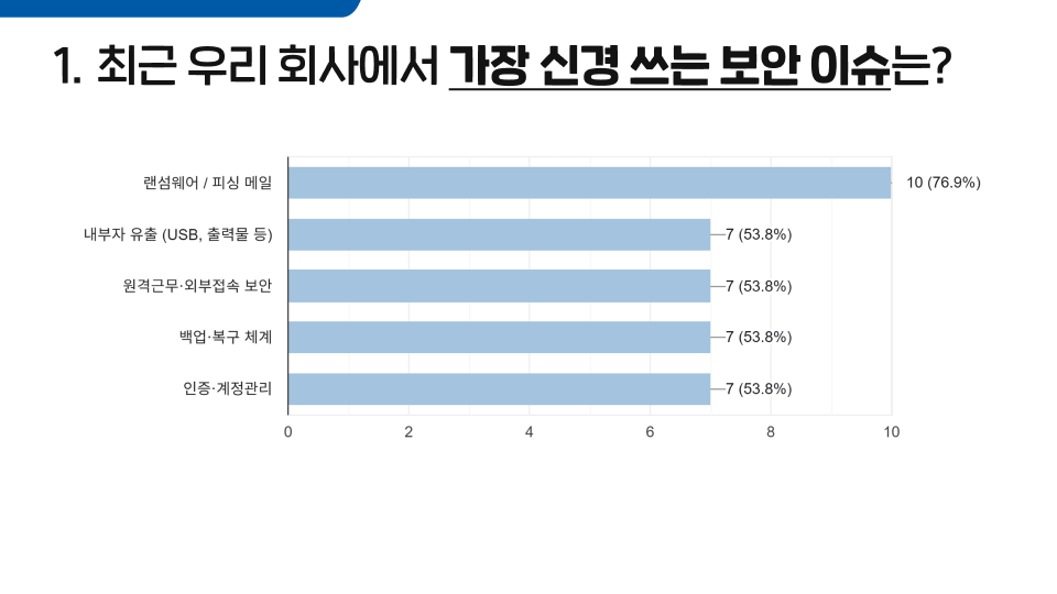 1. 최근 우리 회사에서 가장 신경 쓰는 보안 이슈는?