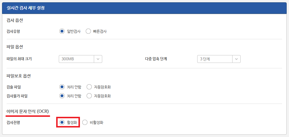 OCR 기능 활성화 시, 이미지 파일 처리를 위해 민감정보 검사 시간이 조금 더 소요될 수 있지만, 더욱 안전하고 정확하게 민감정보를 검출하고 사내 보안을 강화할 수 있습니다.
