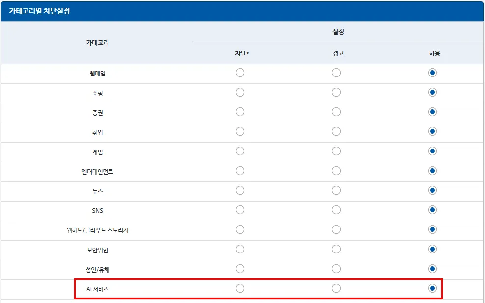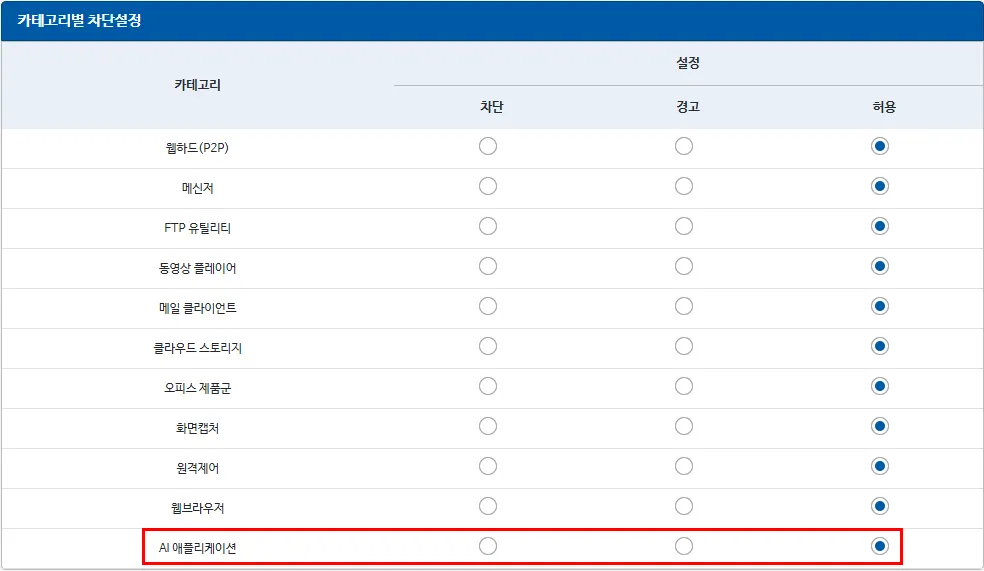 이번 업데이트를 통해 [소프트웨어 실행 차단 정책] / [웹사이트 접속 차단 정책] 에서 신규로 추가된 AI 카테고리를 확인해보실 수 있습니다.